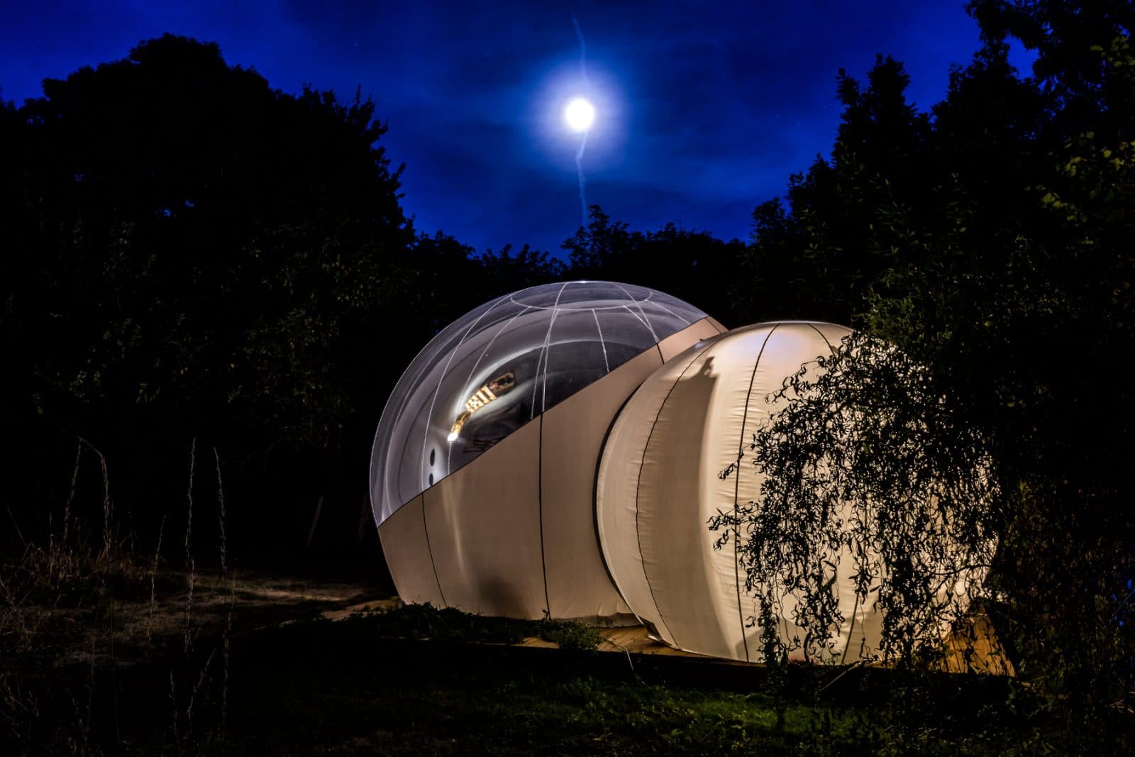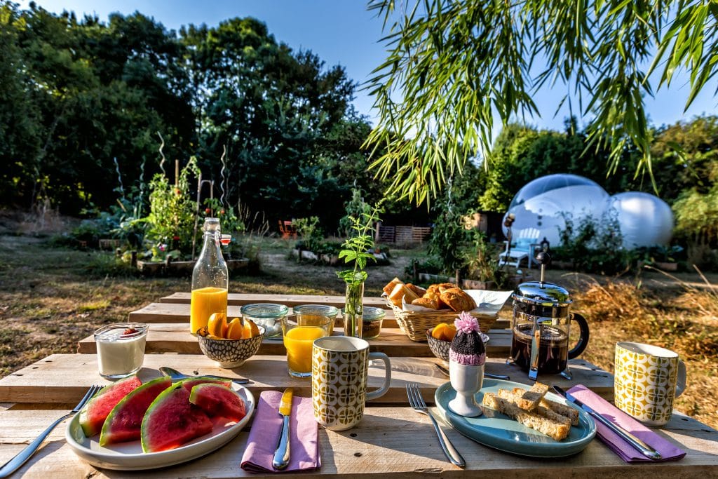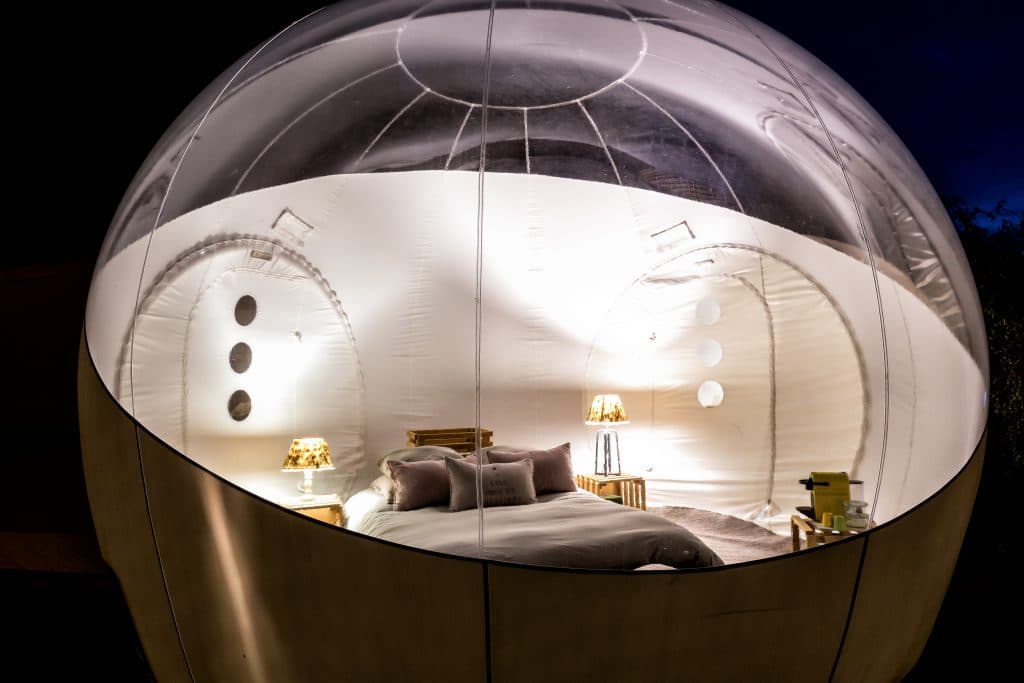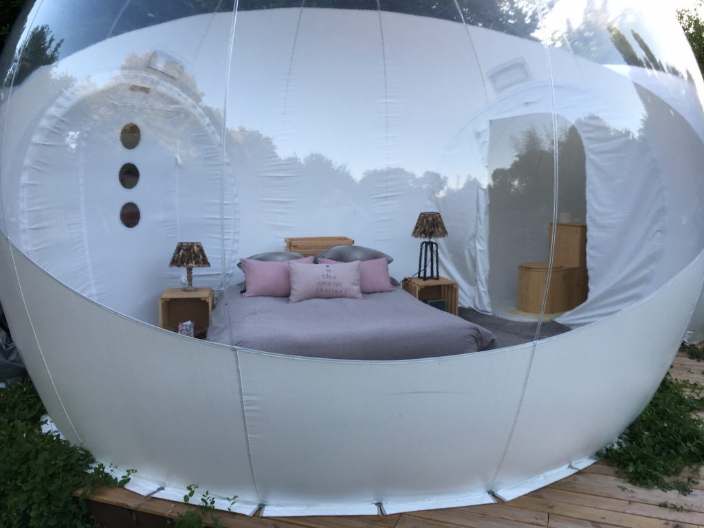 À la recherche d’un petit cocon romantique pour votre escapade à deux ? La bulle d’Aunis, située au Clos de Landrais répondra à toutes vos attentes. En Charente-Maritime, proche la Rochelle découvrez cette petite sphère de bien-être. À l’abri de regards, venez apprécier cet habitat haut de gamme, unique et insolite, en parfaite harmonie avec la nature. Faite pour deux personnes, la bulle est douillettement aménagée et possède des toilettes et un lavabo dans une bulle connectée. La douche se trouve dans un bloc à l’extérieur. Le potager privé, les transats, les hamacs et le mobilier de jardin vous permettront de profiter pleinement du grand air. Vous bénéficierez également sur le domaine d’un accès à la piscine extérieure, au terrain de pétanque, au barbecue… Selon vos envies, différents plateaux de dégustation sont à découvrir, charcuterie fine et fromages ou plateau de fruits de mer. Un vrai régal, servi dans votre jardin ! Et bien évidemment, vous profiterez chaque nuit du spectacle des étoiles, commodément couchés dans votre bulle.