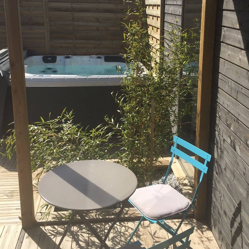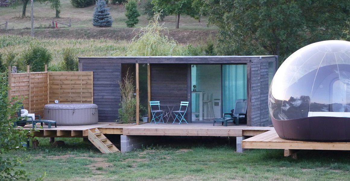 Bulle pour dormir la tête sous les étoiles avec son chalet attenant privatif proposant salle de bain et coin salon, Sauna et jacuzzi permettent de profiter de la nature et de se relaxer avant de profiter d’un grand lit confortable dans la bulle.
